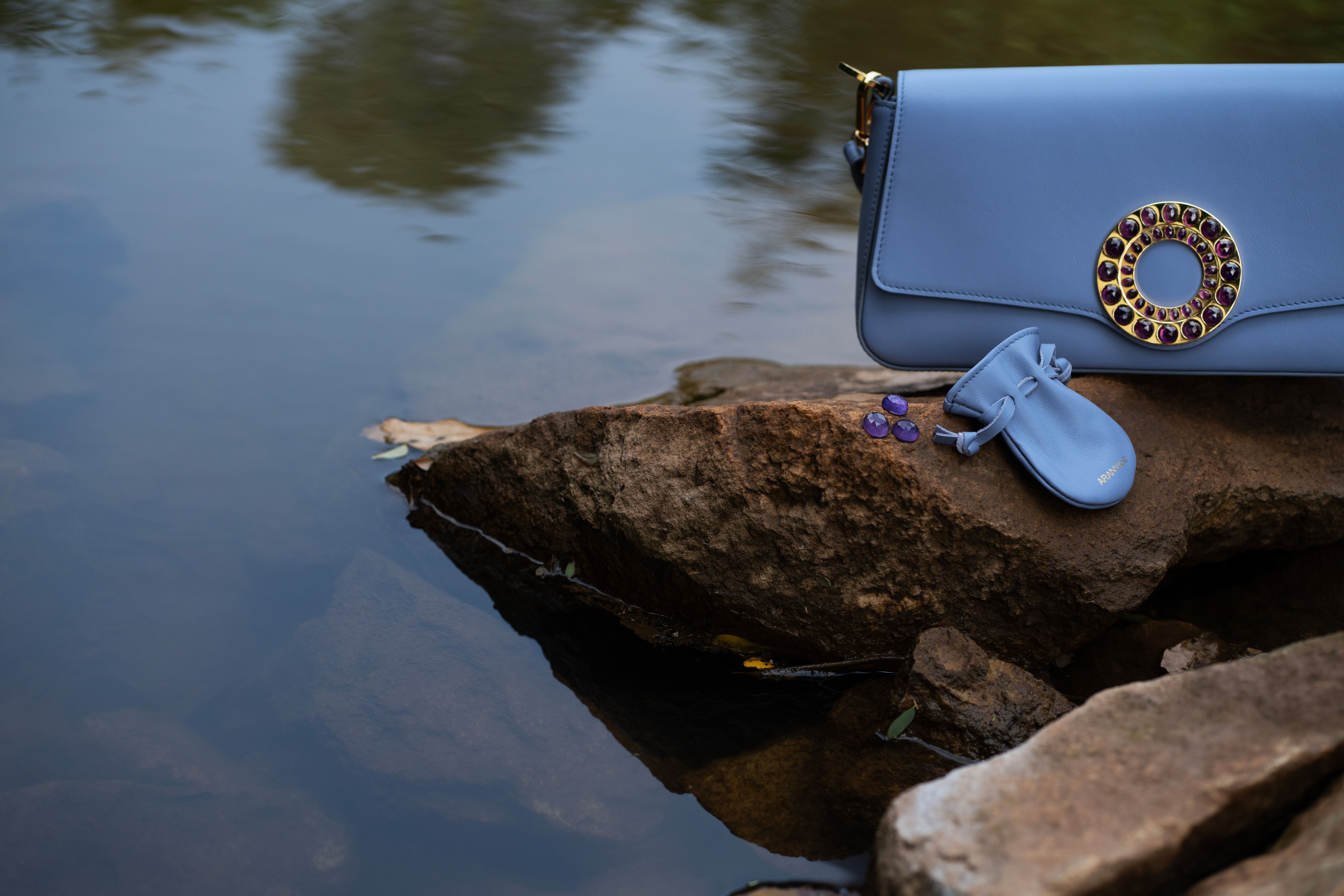 Made with the finest Calf Nappa Leather, the exclusive Amoura shoulder bag is adorned with a 24-Karat Gold Finish. The flap features hand-cut amethyst stones meticulously laid on the 24-Karat gold-plated brass medallion that forms the central element of the bag. It displays regality that resonates with Anne’s character.